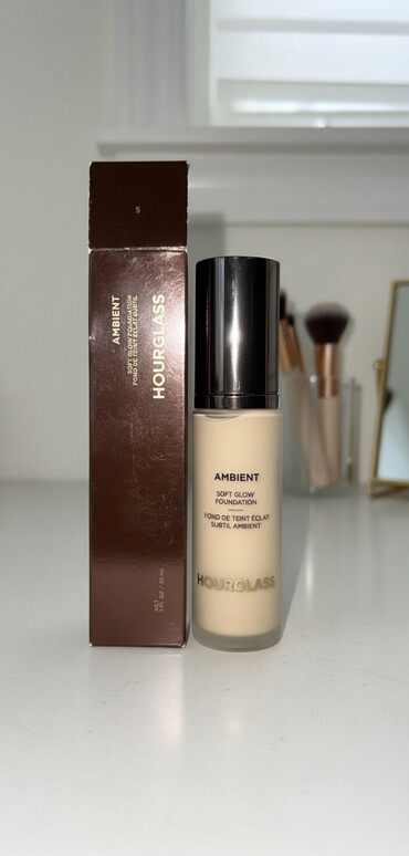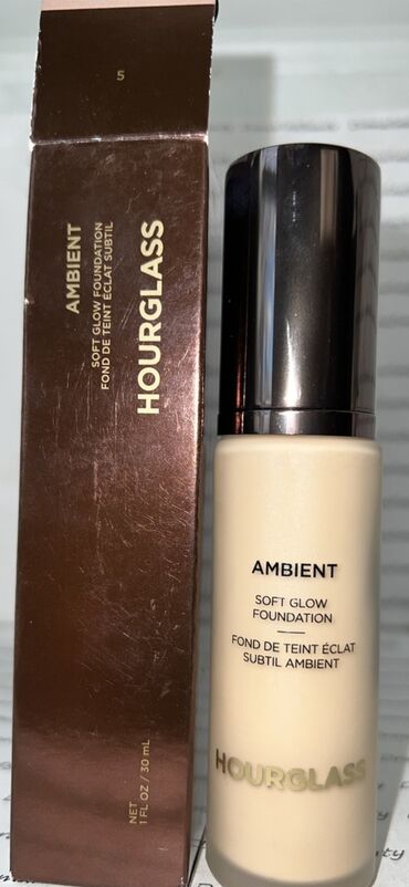 - Məhsul üzərindəki yazılar: “AMBIENT Soft Glow Foundation”, “Hourglass”, “NET 1 FL OZ / 30 mL”.