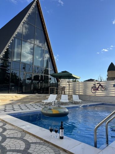 A-Frame dizaynlı müstəqil dağ evi – şəxsi həyət və hovuzla - Üstü tam şüşəli fasadlı A-Frame kottec; geniş panoramik görünüş - Qapalı, yaşıllıqla əhatəli şəxsi həyət; günəşlənmə üçün şezlonqlar, a...