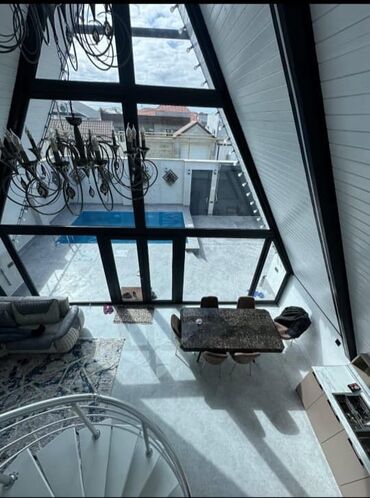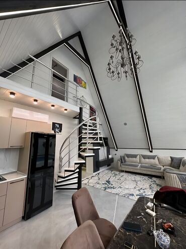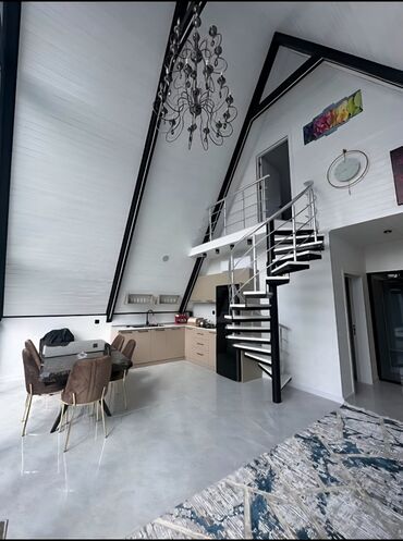 - Daxili: açıq plan zal + mətbəx, loft/antresol yataq otağına qalxan spiral pilləkən, iri çilçıraq, led işıq xəttləri.