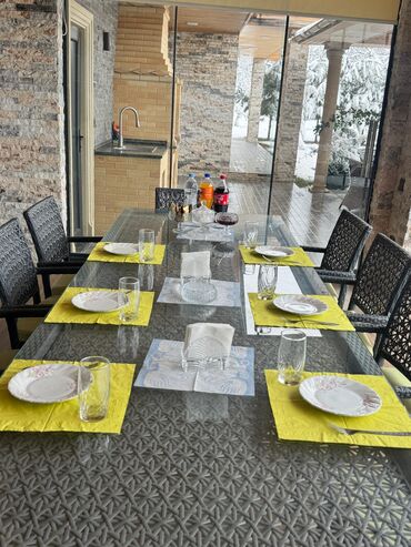- Şüşəbəndli yemək/veranda sahəsi: böyük şüşə masa, 8 yerlik oturacaq, qab-qaşıq və stəkanlarla tam servis.