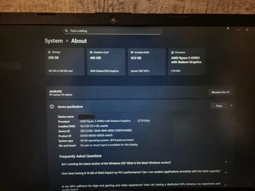 - Prosessor: AMD Ryzen 3 4300U (2.70 GHz), Radeon Graphics inteqrasiya olunmuş qrafika