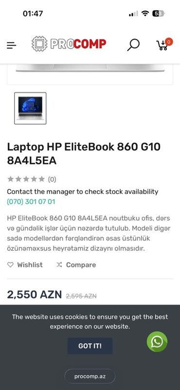İş, dərs və gündəlik istifadə üçün güclü konfiqurasiya, yüngül və incə dizayn, yüksək səs keyfiyyəti və geniş ekranla rahat məhsuldarlıq təqdim edir. Şəkildə sayt məlumatında model adı və 2,550 AZN qiymət qeydi görünür.