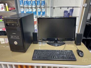 - Monitor: HP LCD (təqribən 20–22 düym), geniş ekran, HDMI/DVI/VGA qoşulma üçün tipik arxa interfeys (kadrda görünən VGA kabeli)