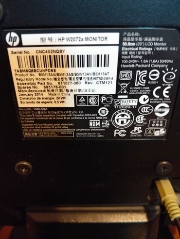 HP V201a monitor Kabelleri var - Ekran: 19.45" (49.4 sm) LCD rəngli monitor - Model: V201a (Regulatory: HSTND-4081-F) - İstehsal tarixi: Mart 2015 - Giriş gücü: VGA AC 100–240V, 1.0A, 50/60Hz - İ...