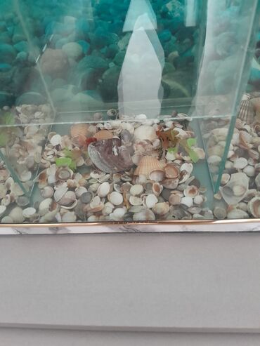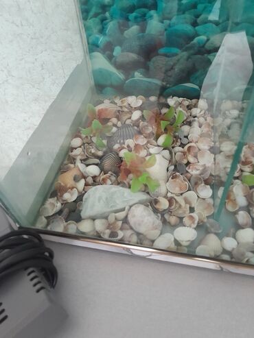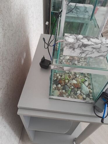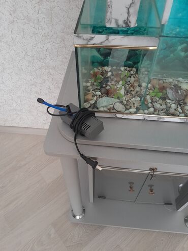 - Böyük ölçülü vitrin tipli akvaryum: geniş ön şüşə, dekorativ ağ çərçivə, üst işıqlandırma, arxa fon dekoru. Aşağıda taxta şkaf/stand (saxlama üçün əlverişli). - Orta ölçülü qövs formalı akvaryum...