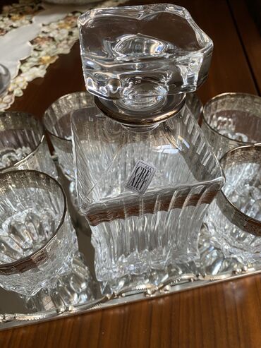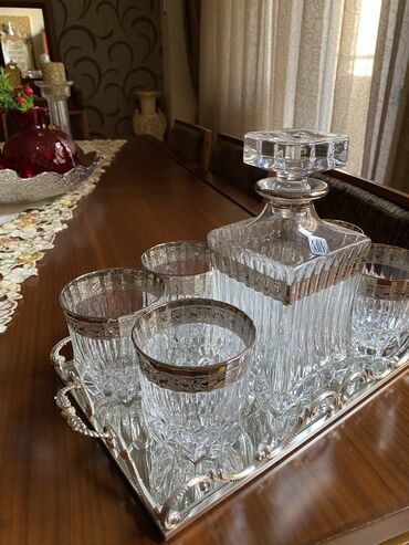 Kristal qrafin dəsti, altı ədəd rumkası ilə birlikdə. Qrafinin uzunsov boynu və geniş aşağı hissəsi var. Stəkanlar da qrafinlə eyni dizaynda, kristal naxışlarla bəzədilib. Həm qonaq qəbulu üçün, hə...