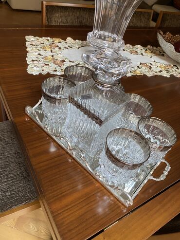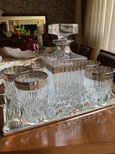 Gümüşü bəzəkləri olan şüşə qrafin və eyni üslubda hazırlanmış 6 ədəd şərab stəkanı. Qrafinin tutacağı və qapağı var. Dəstin dizaynı klassik üslubdadır və hər hansı bir süfrəyə zəriflik qatacaq.