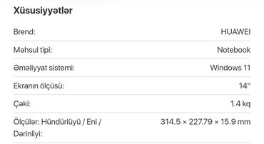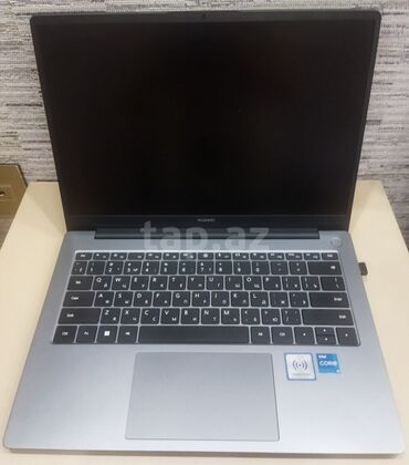 Huawei noutbuk - Ekran: 14" ətrafı incə çərçivəli, mat finish, geniş baxış bucaqları - Klaviatura: tam ölçülü, səssiz klaviatura və böyük touchpad - Əməliyyat sistemi: Windows 11 (sistem bölməsind...