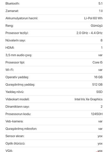 - Prosessor: Intel Core i5-12450H (8 nüvə, 2.0–4.4 GHz)