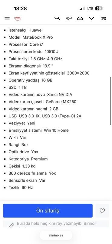Huawei noutbuk – tam qutusunda Məhsul haqqında: - Brend: HUAWEI -