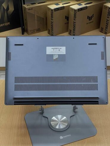 Qutu/mühafizə: Fotolarda noutbukla birlikdə tənzimlənən metal stolüstü stand (FANTECH) göstərilib.