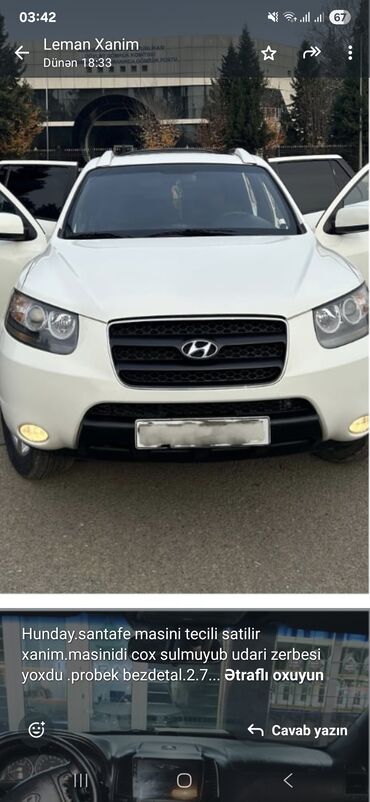 Hunday.santafe masini tecili satilir xanim.masinidi cox sulmuyub udari zerbesi yoxdu .probek bezdetal.2.7matordu.benzindi. 2007 ci ilin masinidi qaraj masinidi cox surulmuyub serviz masinidi 2 matordu avtomat karofkadi4 ceken masindi. 20.mine satilir.Leman86🧚♀️kod4685