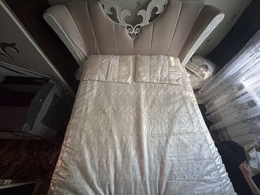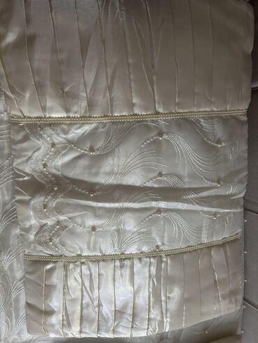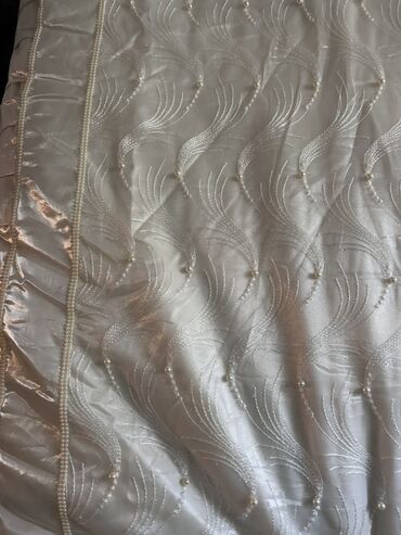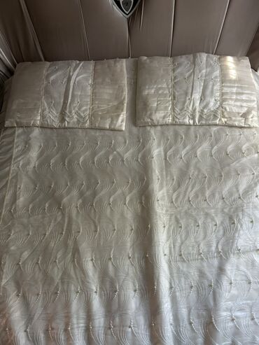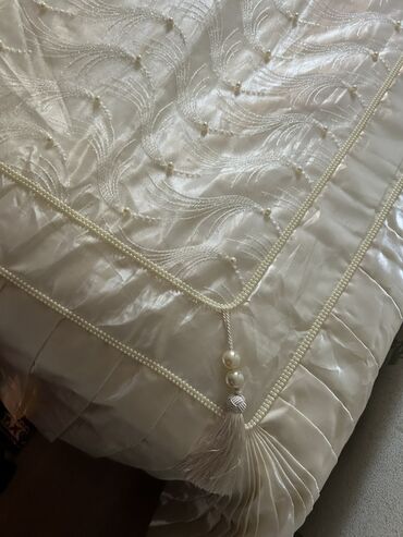 Şık yataq dəsti – atlas parça və zərif tüllə bəzədilmiş örtük və yastıq üzləri - Rəng: krem-şampan tonları, qızılı naxış və haşiyələr - Dizayn: iri çiçək aplikasiyaları, ətrafı incə bəzək tikişlər...