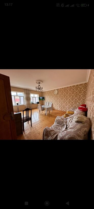 - Geniş və işıqlı zal: iri pəncərələr, dekorativ tavan rozetkası və çilçıraq, taxta döşəmə, naxışlı divar kağızları. Zal hissəsində divan, yemək masası və stullar üçün yer ayrılıb, divar saatı və divara quraşdırılmış TV mövcuddur.