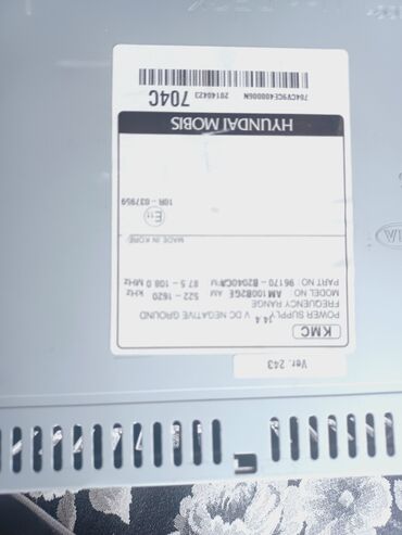 Hyundai Mobis orijinal avtomobil maqnitolası (baş blok) Model: A-9160 (A9100WK), 518C / 1082 kHz qeydli etiket İstehsalçı: Hyundai MOBIS (KMC) Giriş gərginliyi: 14 V DC, mənfi qütblü “ground” Tezl...