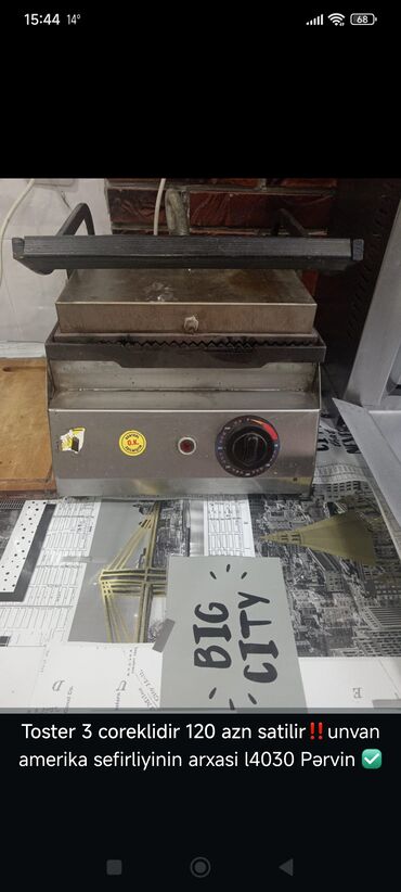 - Kontakt toster/qril pres – termostatlı, temperatur çevirici ilə (30–300°C şkalası), yuxarı-aşağı lövhələr, elektriklə işləyir. Üzərində “Toster 3 çörəklikdir 120 azn satılır” qeydi var.