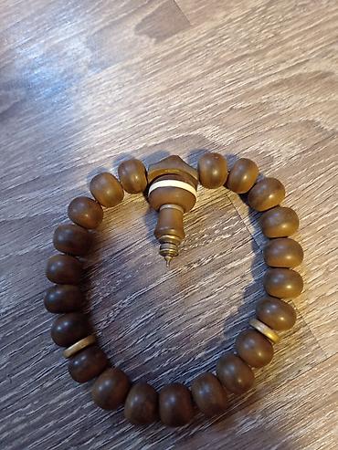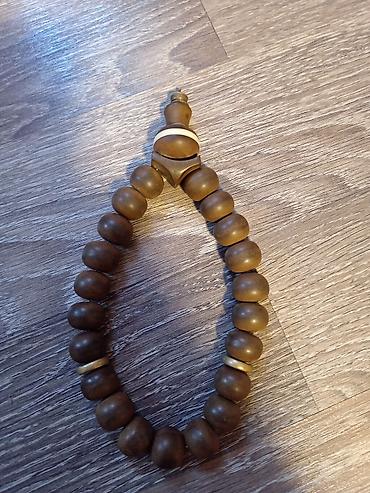 Əl işi Təsbeh – ağac muncuqlu, saçaqlı model - Material: tünd rəngli, cilalanmış ağac muncuqlar - Muncuq sayı: təxminən 22 böyük muncuq + 2 vurğu muncuq - Forma: iri, yumru-silindrik muncuqlar, ha...