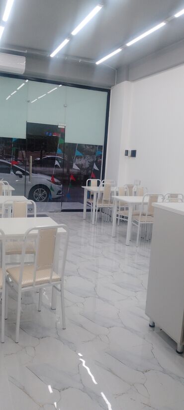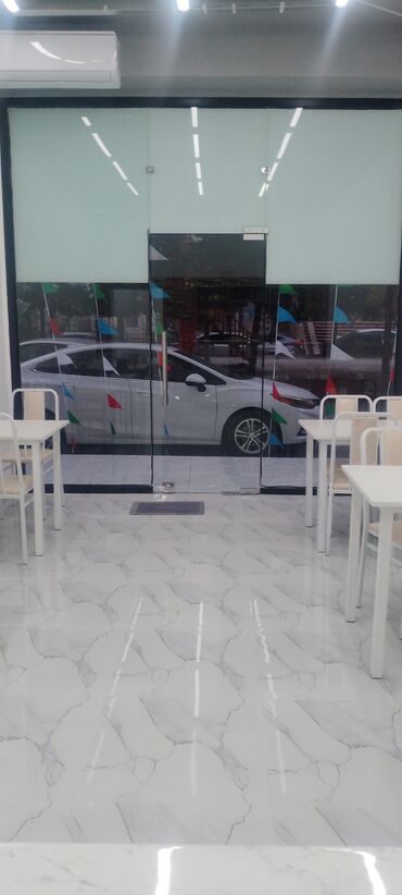 - Tam şüşə ön fasad və vitrin qapı, içəridə parlaq mərmər tipli döşəmə