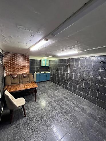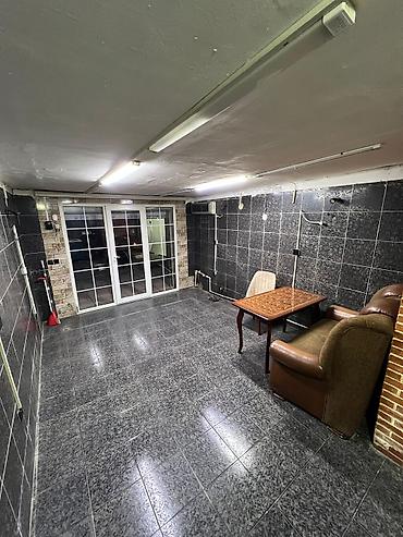 - Tək geniş otaq: tünd çərçivəli kafel divarlar, mərmər naxışlı döşəmə kafeli, asma floresan işıqlandırma