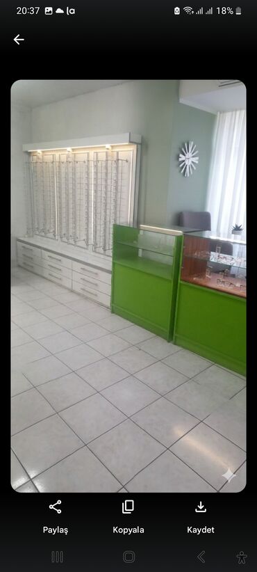 Satılır.Aptek və optik mərkəz Təsvir: - Şəhər küçəsinə çıxışı olan, iri vitrinli “APTEK” və bitişik “Ösma Optik” mərkəzi. - Geniş və işıqlı ticarət sahəsi, vitrin pəncərələri və LED işıqlandırma. ...