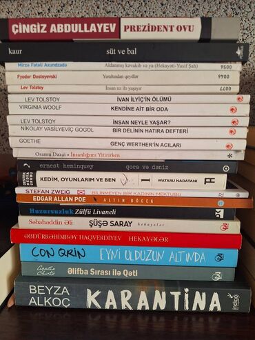 Çatı katı - 4 manat. Siren- 4 manat. Buzdan kıvılcım, Ateşten tezahürat her biri ayrı ayrılıqda 10 azn. Teze, Ciltli ve posterlidi. Real alıcı 050 359 19 22 nömresinin Whatsapına yaza biler