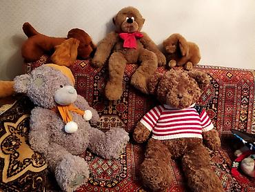 - Fərqli modellər: tünd qəhvəyi iri ayı (boz burunlu, çəhrayı qalstuklu), zolaqlı trikotaj köynək geyinmiş qəhvəyi ayı, boz “Me to You” üslublu ayı (narıncı şarf və papaqla), həmçinin fotoda görünən əlavə ayı və it fiqurlu yumşaq oyuncaqlar.