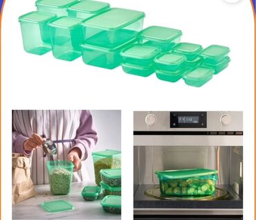 Bu dəst müxtəlif ölçülü yaşıl qapaqlı şəffaf qida qablarından ibarətdir. Yeməklərin saxlanması, qızdırılması və daşınması üçün uyğundur. Qablar quru ərzaqları, bişmiş yeməkləri və digər məhsulları təzə saxlamaq üçün əlverişlidir. Kompakt dizaynı sayəsində istifadə olunmadığı zaman qablar bir-birinin içinə yığıla bilər, bu da yerə qənaət edir. Həm soyuducuda, həm də mikrodalğalı sobada istifadə oluna bilər.