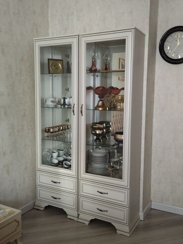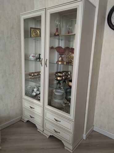 - Material: MDF/taxta karkas, şüşə qapılar və şüşə rəflər