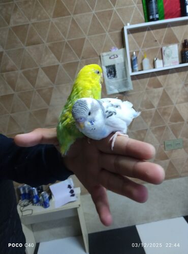 Növlər: Dalmatian rəngli (ağ‑mavi, boz zolaqlı) və parlaq limon‑yaşıl rəngli iki dalğıc büdcərigar (papuqay).