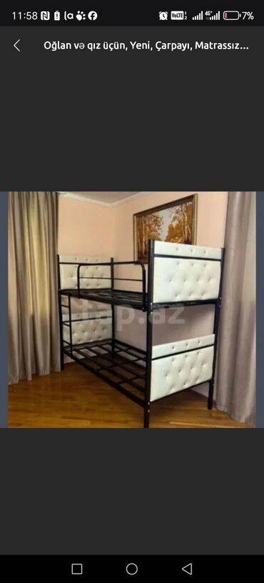 Ağ rəngdə, iki mərtəbəli metal çarpayı. Yataq otağı üçün nəzərdə tutulub, yığcam ölçüsü sayəsində kiçik otaqlarda da rahatlıqla istifadə oluna bilər. Üzərində döşəklərlə birlikdə təklif olunur.