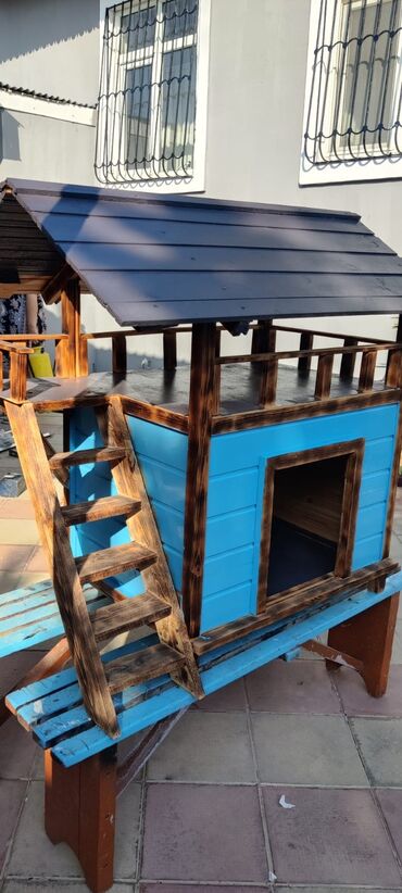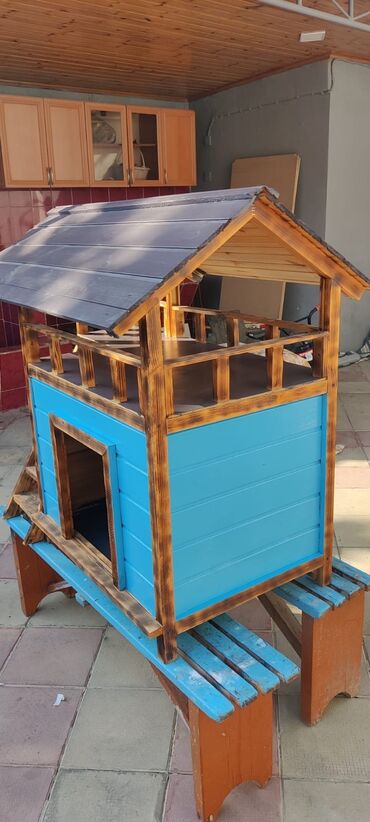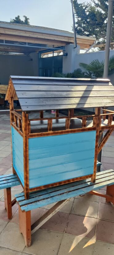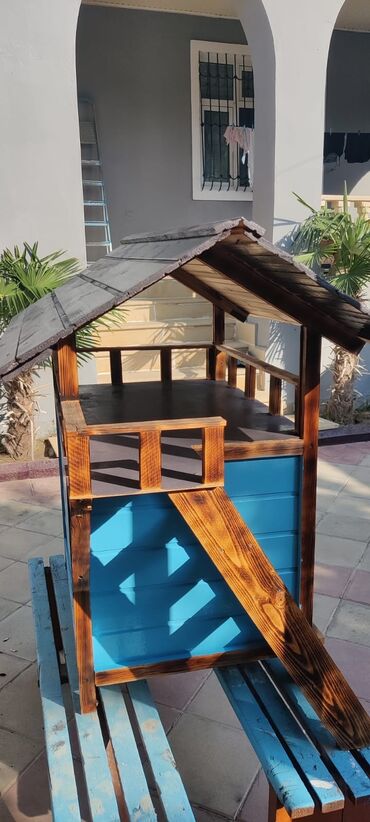 - Material: tamamilə ağacdan hazırlanıb, yandırma effektli çərçivə, mavi rəngli yan panellər, tünd rəngli şifer tipli taxta dam.