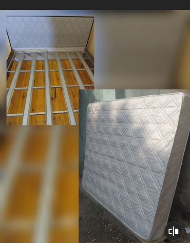 İki nəfərlik yataq bazası və döşək dəsti - Komplekt: metal karkaslı iki nəfərlik yataq bazası + ortopedik tip döşək - Ölçü: təxmini 160×200 sm (vizuallara əsasən geniş iki nəfərlik) - Döşək: ağ rə...