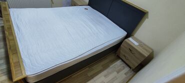 Yataq otağı mebel dəsti Tərkib: - İkinefərlik çarpayı: yumşaq, kvadrat tikişli başlıq, neytral qəhvəyi tonlarda. Ağ, naxışlı örtüklə. - 2 ədəd tumbi: hər birində 2 çekmece, taxta teksturalı korpus...