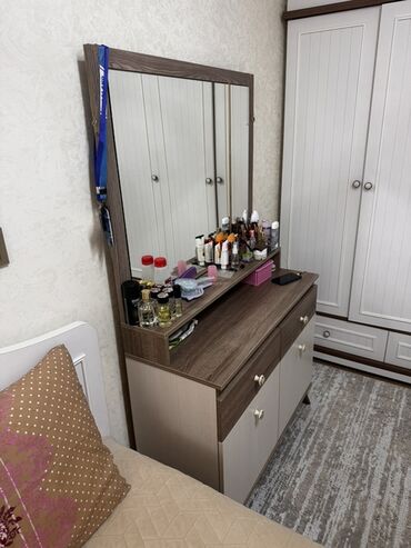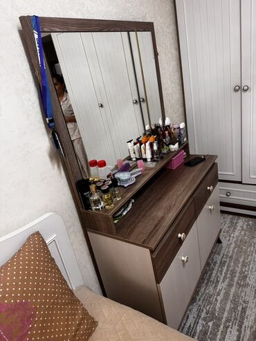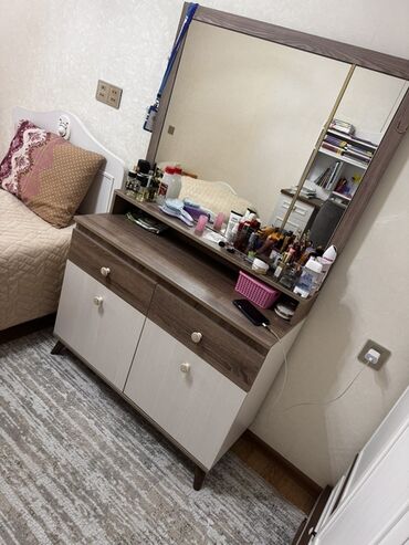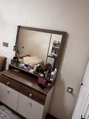 Açıq palıd rəngində böyük şkaf/komod. sol skafda biraz bosduq var.bele basga qiriqi falan yoxdur. ayna ayridi. aynanida ustunde isteses verirem. - Üst hissə: geniş düz səth – kosmetika, bəzək əşya...