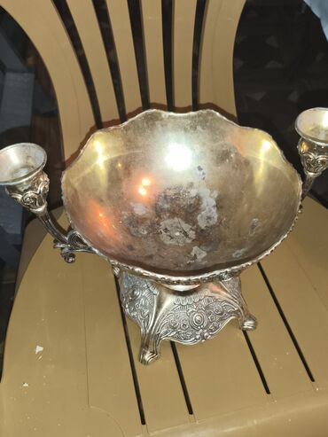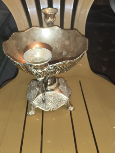 Klassik üslubda dekorativ metal qab – iki şamaltılığı olan masa mərkəzliyi.