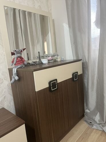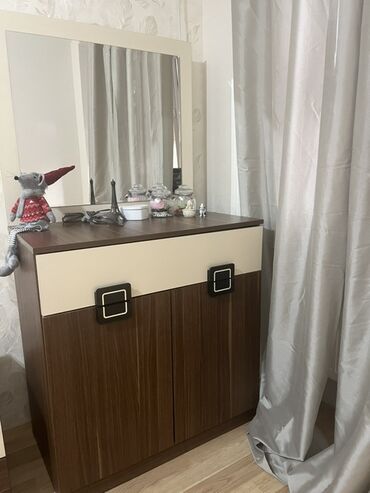 Mebel dəsti: güzgülü komod/визаж stolüstü - Material: laminatlaşdırılmış MDF/LDSP, tünd qəhvəyi korpus, açıq krem rəngli ön panel - Dizayn: iri düzbucaqlı güzgü ilə birləşmiş kompakt komod; güzgün...
