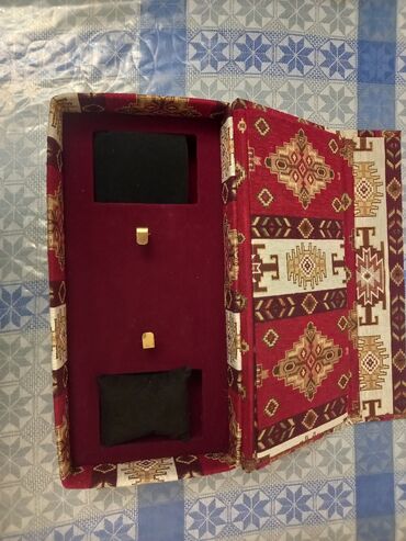 Zərgərlik/qol saatı üçün dekorativ qutu - Material: xarici hissə toxumalı naxışlı qara süni dəri görünüşlü örtük - Daxili: parlaq qırmızı atlas/parça astar – zərif və yumşaq qoruyucu səth - Metal ...
