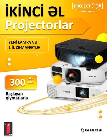 - İkinci əl proyektorlar: Yeni lampa ilə təchiz olunur və 1 il zəmanətlə təqdim edilir. Şəkildə Epson və digər modellər göstərilir.