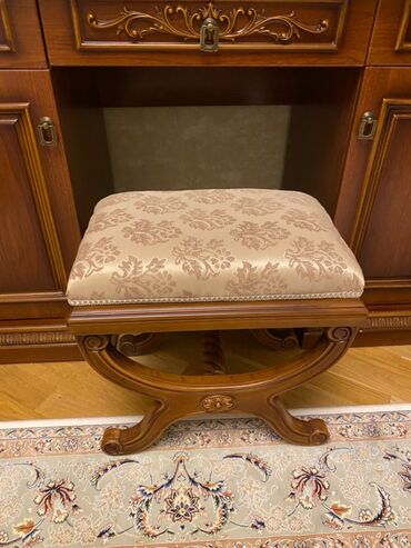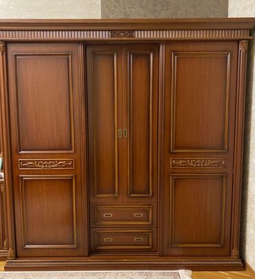 Klassik üslubda yataq otağı dəsti - Rəng: krem/şampan tonları, qızılı ornamentlərlə - Üslub: klassik, oyma dekor və relyefli detallar Dəst tərkibi: 1) Geniş ikinəfərlik çarpayı - Yumşaq başlıq: k...