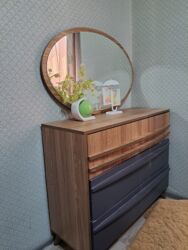 - Paltar komodu: 4 çəkməcəli (üst iki bölmə ağac teksturası, alt iki bölmə tünd boz), üstündə dairəvi güzgü.