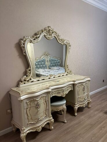 Yataq otağı dəsti – 760 AZN Çatdırılma pulsuz Komplekt: - 4 qapılı şkaf (iki orta qapı güzgülü, qızılı dekor panellər) - Makyaj masası böyük güzgü ilə, bir çəkməcə və qapalı bölmə - Geniş çarpayı...