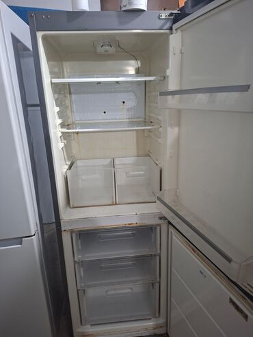 - Üst bölmə: 2 şüşə raf, tərəvəz üçün 2 çekmece, qapıda uzun şüşə/butilka rəfi