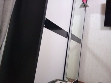 - Dizayn: Bir qapı tam güzgülü, digəri ağ panelli; hər iki qapının ortasında dekorativ qara zolaq. Korpus kənarları qara çərçivə ilə tamamlanıb.