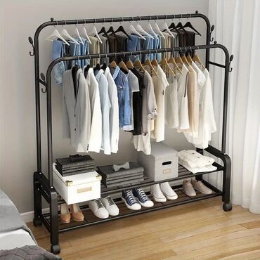 - Quruluş: iki səviyyəli asma çubuq (uzun paltarlar, köynək və üst geyimlər üçün), geniş alt rəf (çəkmə, ayaqqabı, çamadan, səbət və qutular üçün).