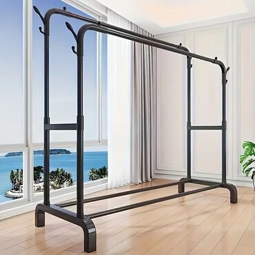 Saxlama tutumunu artıran praktik həll: paltarları səliqəli asmaq, alt rəfdə ayaqqabı və qablaşdırmanı yerləşdirmək üçün ideal. Minimalist qara rəng istənilən interyerə uyğunlaşır.