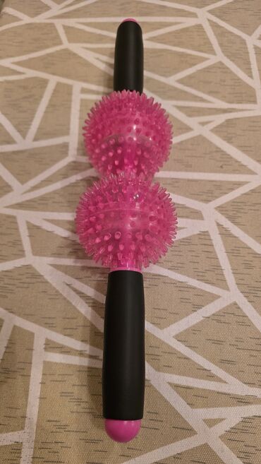 İki başlı masaj rulonu – masaj sünbüllü toplarla - Rənglər: çəhrayı və mavi - Quruluş: ortada iki ədəd elastik, sünbüllü masaj topu; hər iki başda sürüşməyən qara tutacaq - Material: yumşaq, elast...