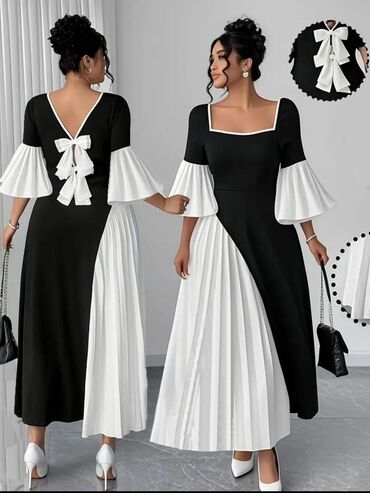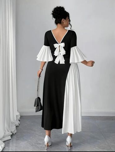 Klassik qara-ağ palitrası, qadınsı detallar və arxadakı bant ilə mərasim, dəvət və şık gündəlik çıxışlar üçün uyğun. Ağ dikdaban və kiçik çanta ilə mükəmməl kombinlənir.