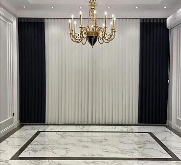 - Dizayn: İkiqat qatlama – iç qatda zərif tull (ağ/ekru), üst qatda işıqlı məkanı yumşaq şəkildə qaranlıqlaşdıran qalın parça (tünd mavi, qara və ya antrasit tonları). Kenar-qıfla tikiş və vahid, səliqəli büzgü xətti.