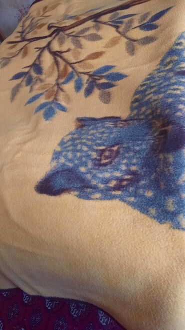 Qalın, yumşaq ipək-plüş tipli yorğan/pled - Dizayn: böyük pələng motivli ikiüzlü naxış. Bir üzü krem fon üzərində mavi-qəhvəyi pələng və budaqlar, digər üzündə tünd göy fon üzərində krem–mavi zola...