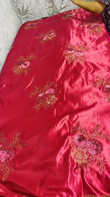 İkiüzlü yorğan - Ölçü: təxminən iki nəfərlik (şəkildə böyük ölçülü, döşəməni tam örtür) - Material: parlaq atlas tipli parça - Rəng və dizayn: - Bir üzü tək rəngli qırmızı, üzərində zərif naxışl...